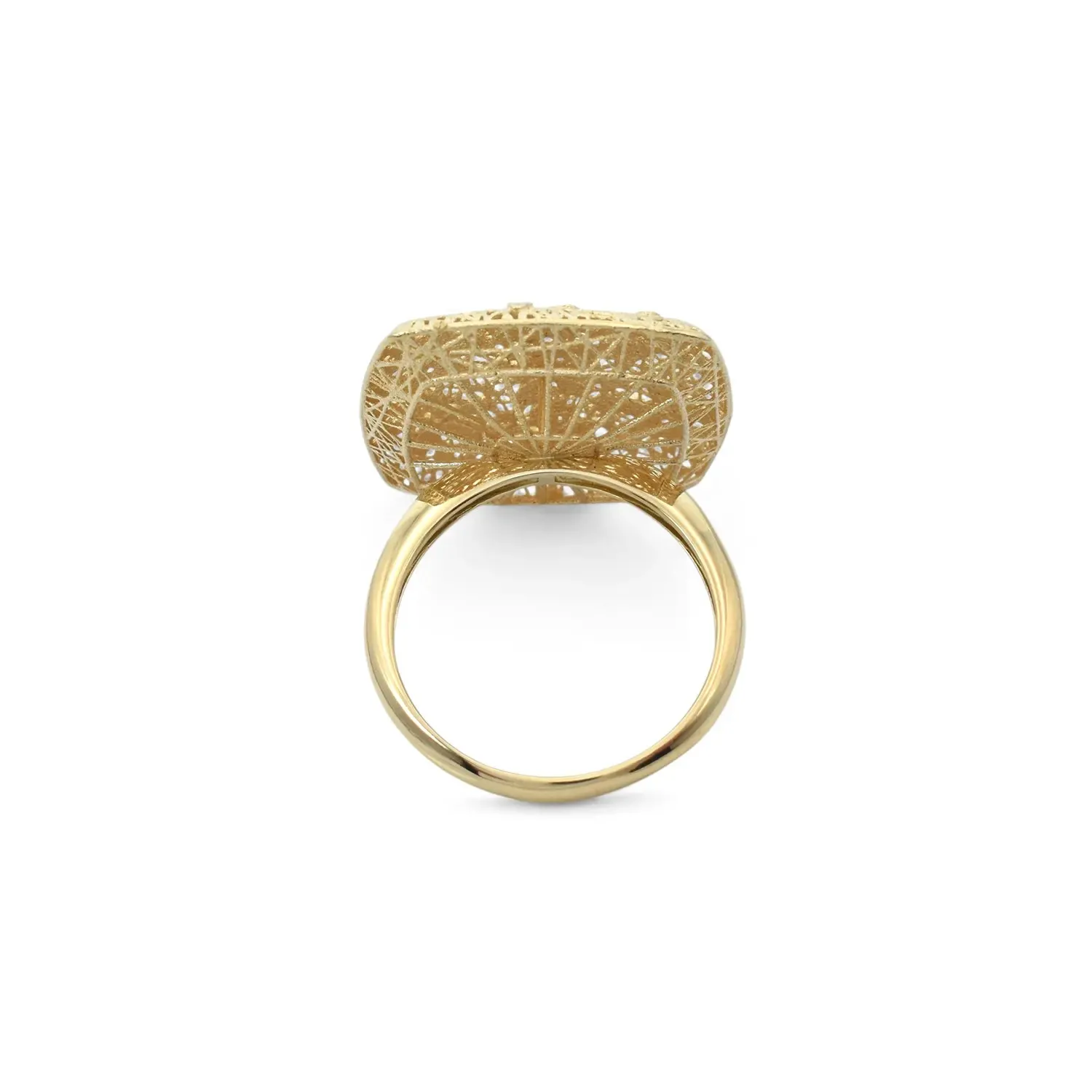Una obra de arte para lucir: este anillo de oro de 18 quilates con forma de escudo cautiva por su extraordinaria artesanía. Su majestuosa forma cuadrada presenta un delicado diseño de panal en oro amarillo, adornado con luminosas incrustaciones de oro blanco en forma de pétalos y flores, talladas con precisión para reflejar cada rayo de luz.