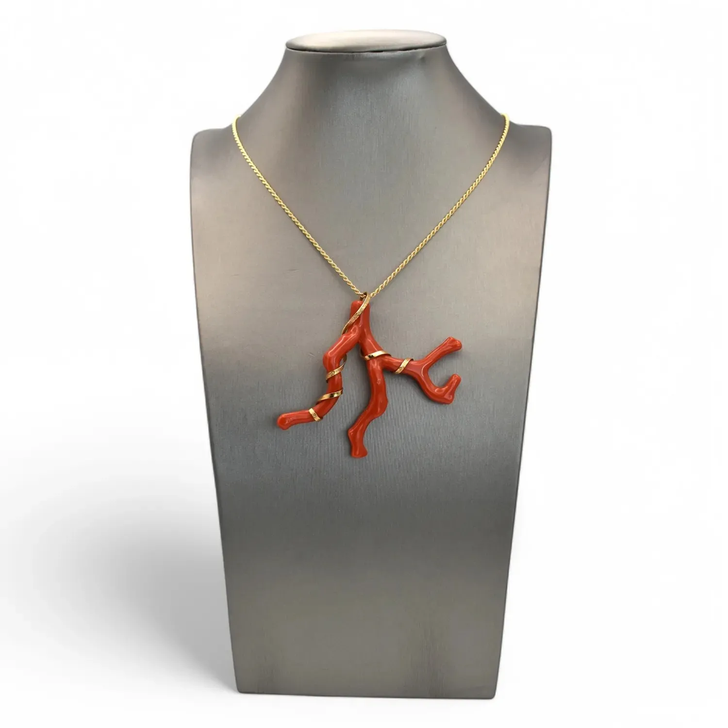 Impresionante colgante elaborado artesanalmente con una rama natural de coral rojo mediterráneo, adornado con envolventes detalles en oro amarillo de 18kt.