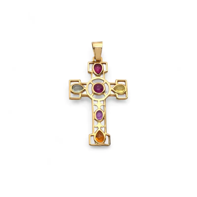 Colgante de cruz Stella Maris en oro amarillo de 18 kt con cabujón de duralita coloreada