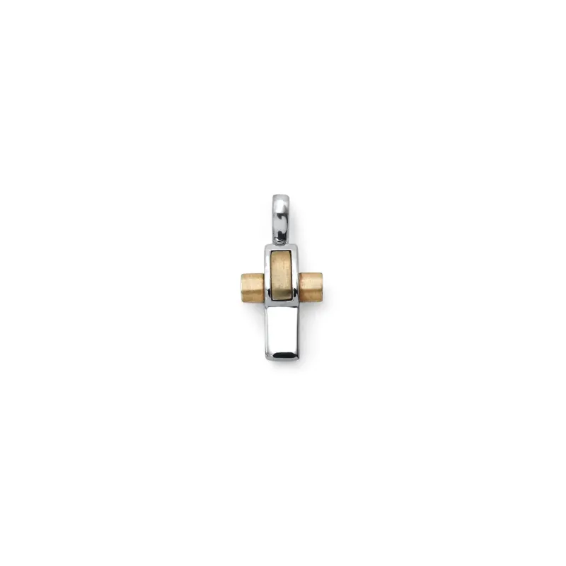 Este colgante de cruz en oro bicolor de 18 kt es una pieza moderna y distintiva, con un cautivador contraste de materiales. La sección central está elaborada en oro amarillo con acabado satinado, mientras que los extremos de la cruz son de oro blanco, creando un look sofisticado y masculino. Con 3 cm de largo y 4,4 g de peso, es un accesorio sólido y llamativo, perfecto para quienes buscan un símbolo de fe que también sea una expresión de estilo contemporáneo.