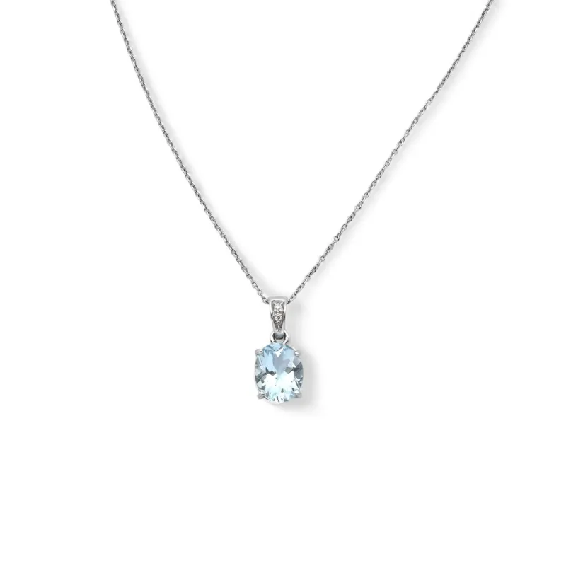 Collar de oro blanco de 18 kt con aguamarina ovalada y diamantes a su alrededor.