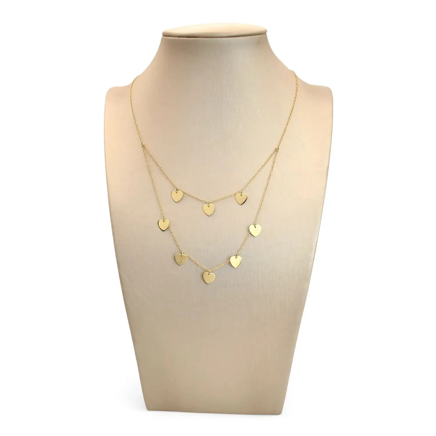 Este collar multicapa de oro amarillo de 18 quilates es una pieza romántica y visualmente impactante. Está compuesto por dos finas cadenas superpuestas (ya unidas, creando un efecto de capas) a lo largo de las cuales se encuentran pequeños colgantes planos y brillantes en forma de corazón, espaciados a intervalos regulares. Con una longitud de 42 cm (longitud típica de la cadena superior) y un peso de 3,5 g, este collar combina la tendencia de las capas con la elegancia clásica del oro de 18 quilates, lo que lo hace perfecto para realzar el escote con un toque de feminidad.