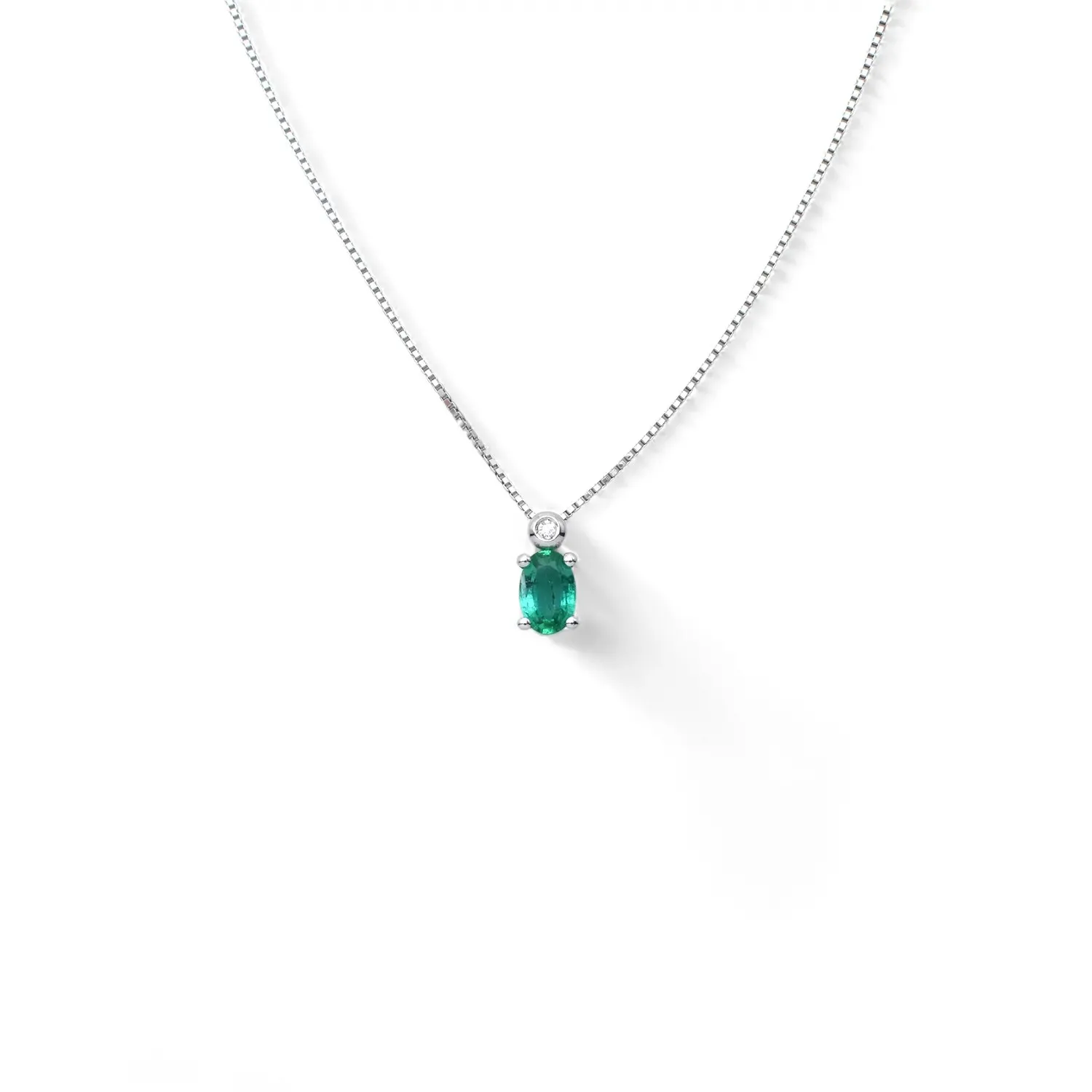 Este refinado collar de oro blanco de 18 quilates presenta un elegante colgante de diseño clásico. La pieza central es una esmeralda de talla ovalada de 0,05 ct, coronada por un diamante de talla brillante de 0,01 ct que realza su belleza. El colgante está montado sobre una fina y resistente cadena de gargantilla veneciana, que realza su brillo y garantiza un ajuste perfecto. Una pieza delicada y atemporal, ideal para quienes aman la intensidad del verde esmeralda combinada con la pureza del oro blanco. Excelencia artesanal. Hecho en Italia.
