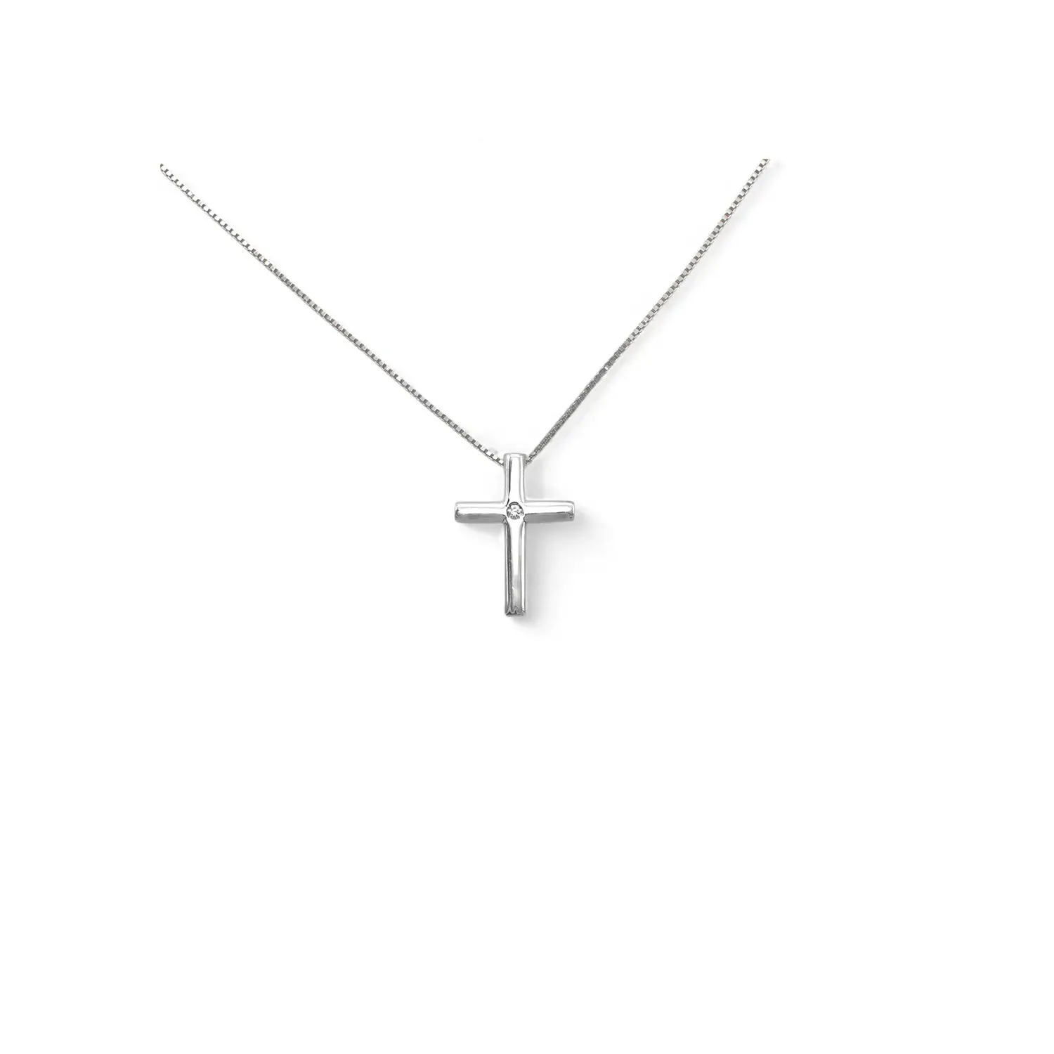 Este elegante collar de oro blanco de 18 quilates presenta un diseño clásico y refinado, ideal como pieza de joyería simbólica y atemporal. El colgante en forma de cruz, de líneas limpias y modernas, alberga un diamante de talla brillante de 0,01 ct en su centro, que le aporta un toque discreto y precioso. La pieza incluye una cadena de estilo veneciano de 40 cm, conocida por su exclusivo eslabón cuadrado que garantiza durabilidad y un brillo constante. Con un peso total de 2,60 gramos, este collar representa la cumbre de la artesanía italiana, perfecto para celebrar ocasiones especiales con sobria elegancia.