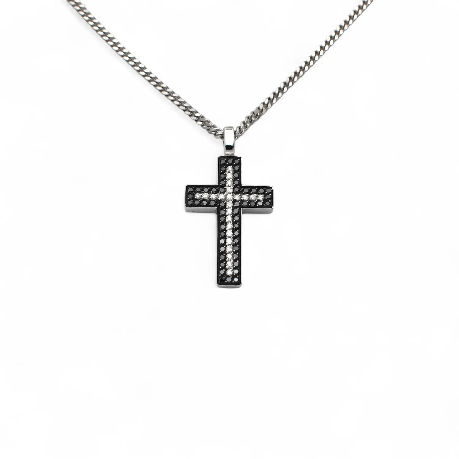 Collar unisex de oro blanco de 18 kt con cadena Groumette y cruz con diamantes blancos y negros