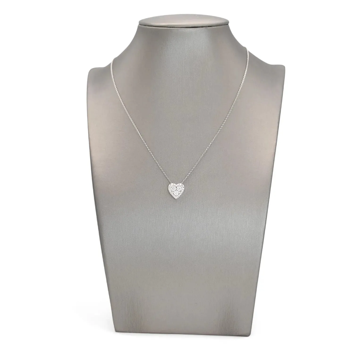 Este encantador collar de oro blanco de 18 quilates celebra el amor con un colgante en forma de corazón con un diseño luminoso y atemporal. La superficie del corazón está completamente adornada con diamantes de talla brillante de 0,56 quilates, engastados con extrema precisión para crear un reflejo continuo y brillante. Con un peso de 4,10 gramos, la pieza luce una estructura sólida y un acabado pulido a espejo que realza la blancura del oro blanco. La refinada orfebrería italiana transforma este símbolo clásico en un sofisticado accesorio de lujo, ideal para celebrar un momento inolvidable o para añadir un toque de brillo cotidiano a tu escote.