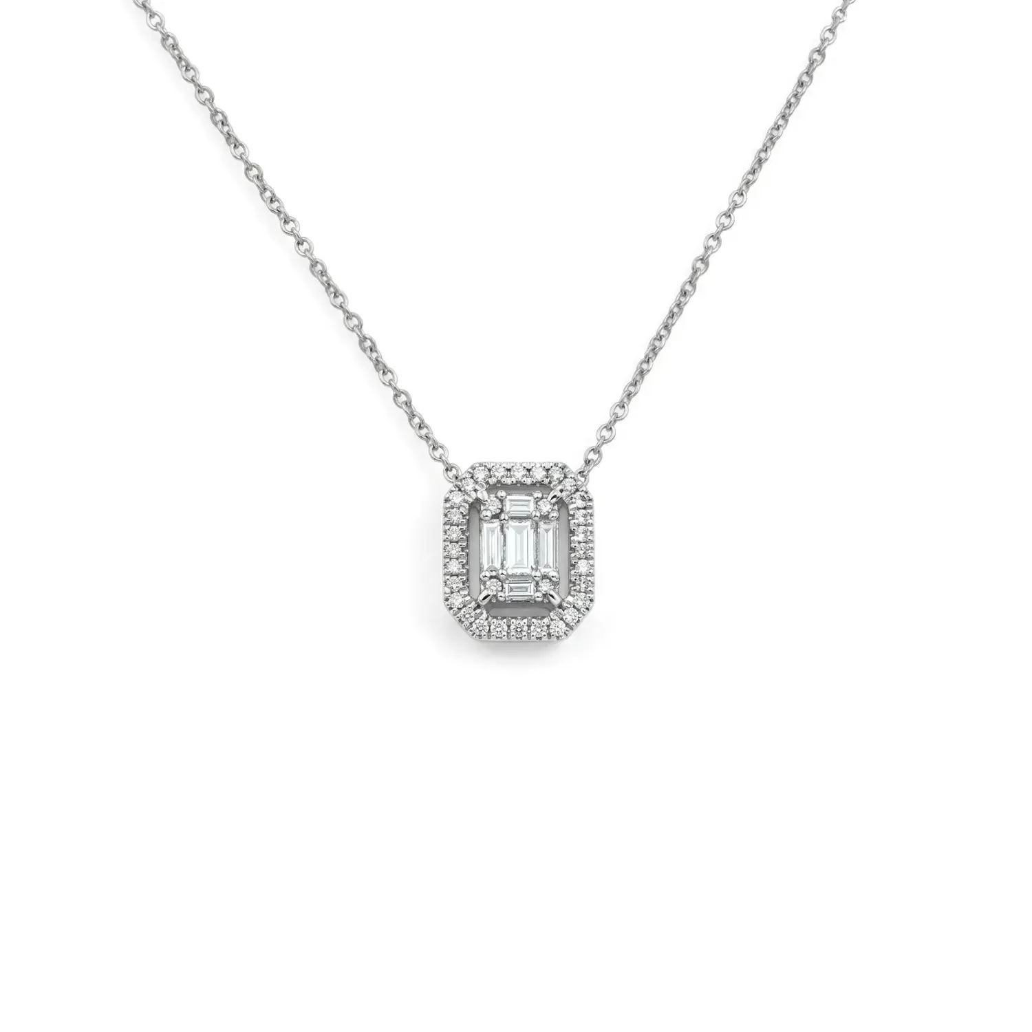 Esta refinada gargantilla de oro blanco de 18 quilates es una oda al diseño geométrico y a la sofisticación de la luz. El colgante, con su distintiva forma octogonal, presenta un corazón compuesto por diamantes talla baguette, engastados con precisión milimétrica para crear una superficie espejada impecable. Esta composición central está rodeada por un espléndido marco de diamantes talla brillante, con un peso total de 0,19 quilates.