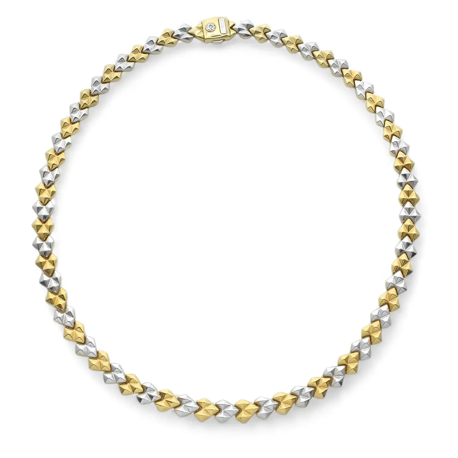 Este suntuoso collar de oro amarillo y blanco de 18 quilates es una obra maestra de diseño geométrico y precisión técnica. El eslabón se compone de una secuencia ininterrumpida de elementos piramidales facetados que alternan rítmicamente entre los dos tonos de oro, creando un juego de volúmenes y reflejos que captura la luz con cada movimiento.