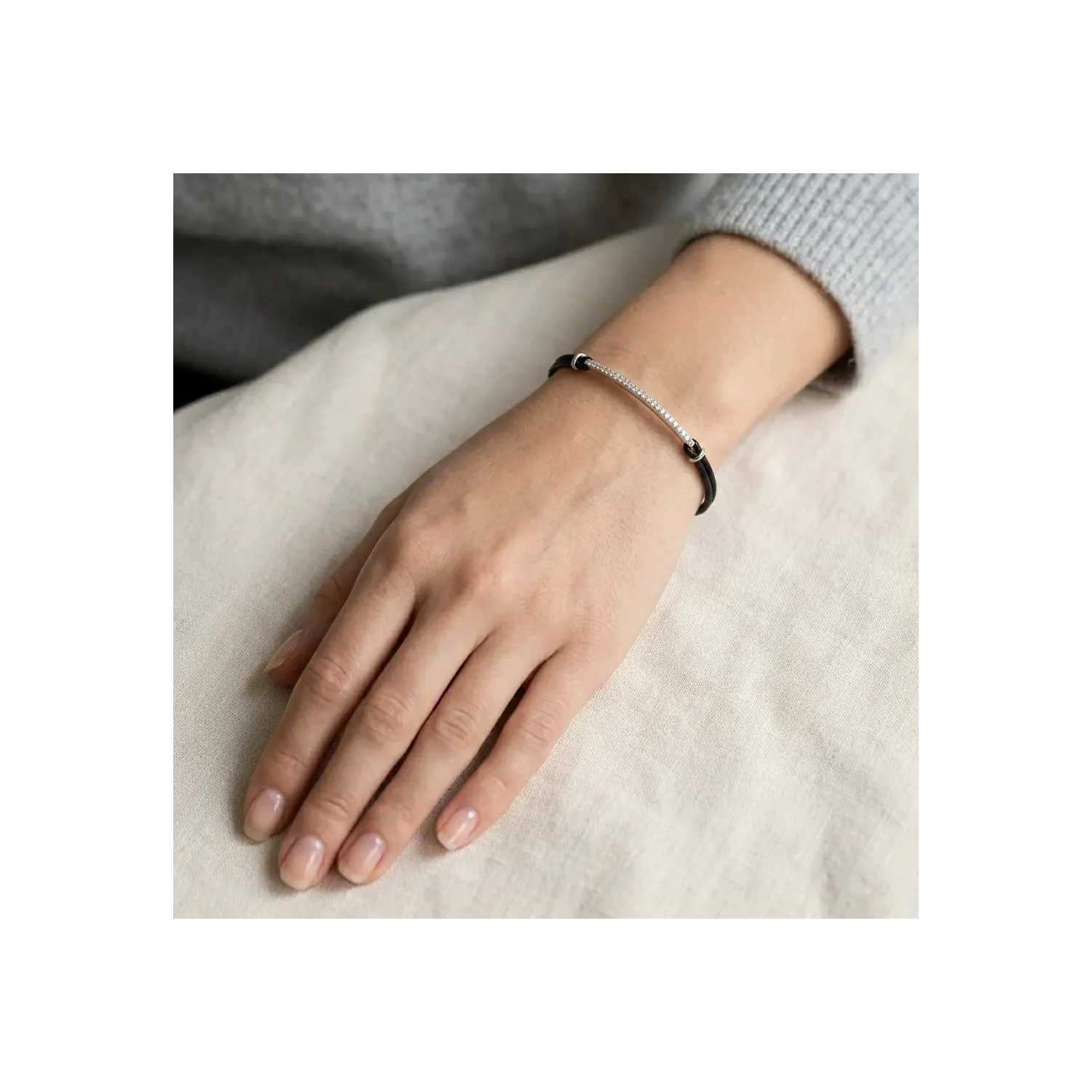 Esta original pulsera unisex combina la elegancia de la joyería fina con un estilo dinámico y moderno. Elaborada con un resistente cordón de algodón encerado negro, la pieza está adornada con inserciones de oro blanco de 18 quilates que albergan diamantes de talla brillante, con un peso total de 0,30 quilates. Con un peso de 3,60 gramos, esta pulsera está diseñada para resistir el uso diario sin renunciar a un toque de brillo sofisticado. Su diseño minimalista y el contraste de color entre el negro intenso del algodón y el brillo de los diamantes la convierten en el accesorio perfecto tanto para hombre como para mujer. Una pieza de diseño italiano contemporáneo, ideal para quienes buscan un lujo discreto y a la moda.