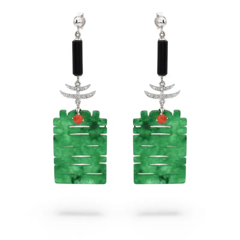 Pendientes colgantes en oro blanco de 18 kt con jade, ónix, coral y diamantes