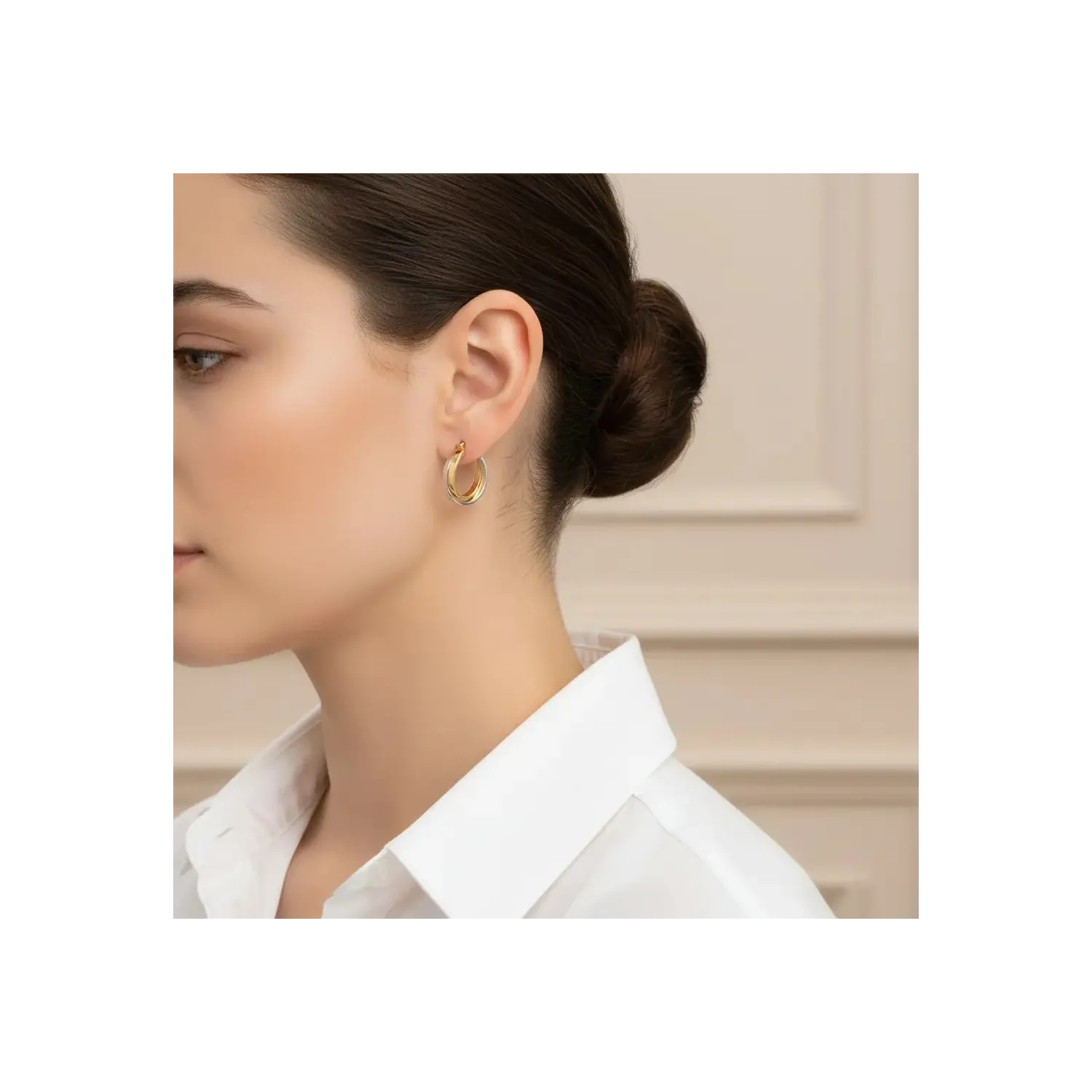 Estos elegantes pendientes de aro de oro bicolor de 18 quilates presentan un diseño clásico renovado con un toque de sofisticación moderna. Están compuestos por dos aros entrelazados: uno en oro amarillo pulido y el otro en oro blanco brillante. El entrelazado crea un efecto tridimensional dinámico que captura la luz, ofreciendo un juego único de colores y reflejos. Con un diámetro de 2 cm y un peso de 1,8 g, son ligeros y cómodos de llevar, perfectos para añadir un toque de elegancia contemporánea a cualquier look, desde el más casual chic hasta las ocasiones más especiales.
