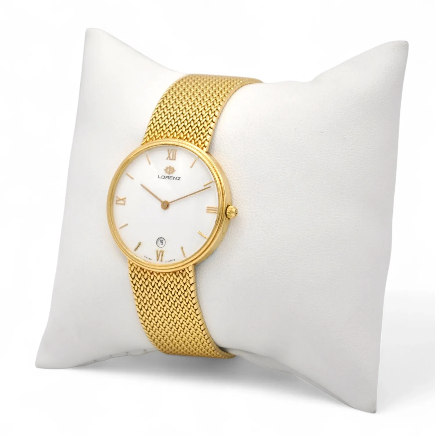 Elegante reloj vintage Lorenz en oro amarillo, una auténtica joya del diseño alemán. La caja redonda, de líneas limpias y refinadas, confiere al reloj una elegancia atemporal. La esfera blanca, con números romanos y agujas en forma de hoja, pulsera de malla milanesa, está en perfecto estado. La pulsera de malla milanesa de oro amarillo añade un toque de sofisticación y comodidad. El movimiento de cuarzo garantiza precisión y fiabilidad. Una pieza de colección única, perfecta para quienes buscan un reloj con un diseño clásico y un encanto atemporal.