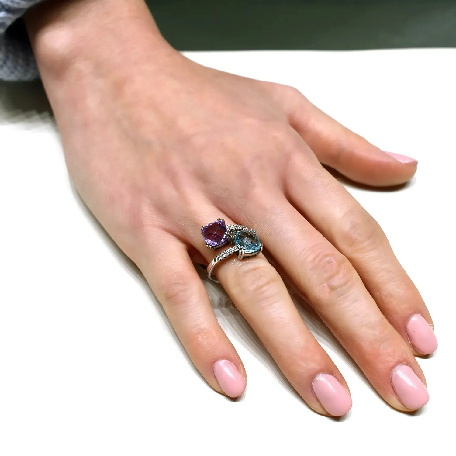 Anello in oro bianco contraré con topazio azzurro e ametista