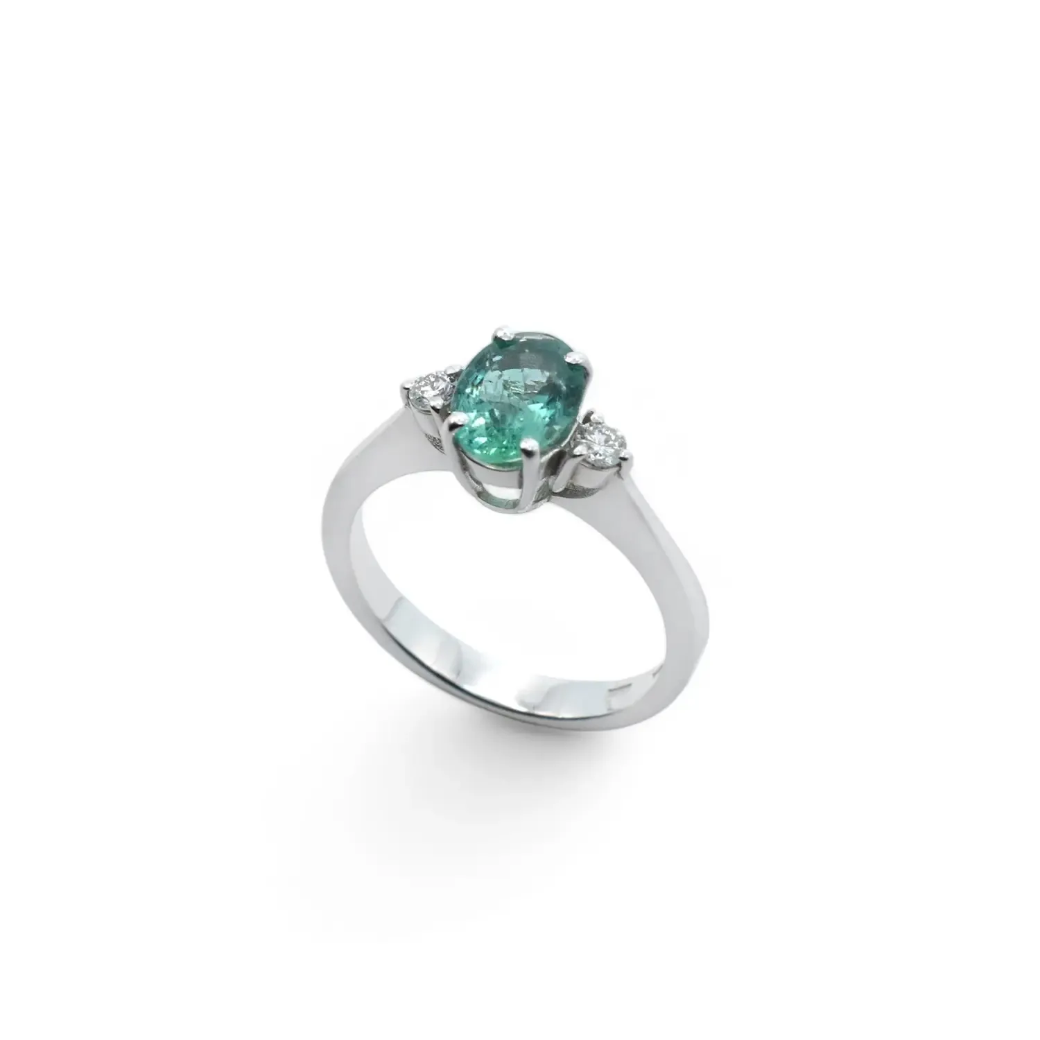 Anello in oro bianco con diamanti e smeraldo centrale ovale