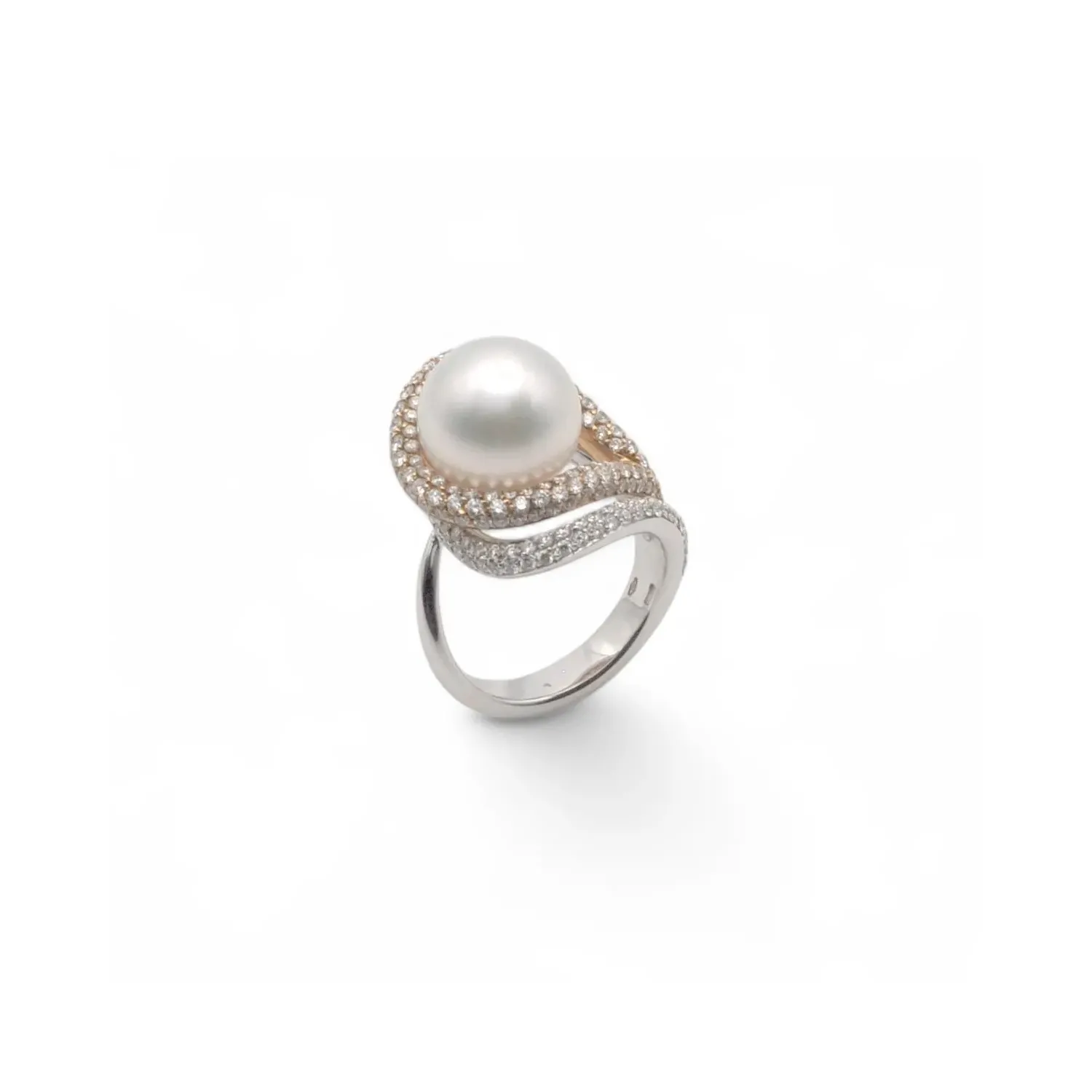 Anello in oro bianco e rosa con pavè di diamanti e perla australiana centrale