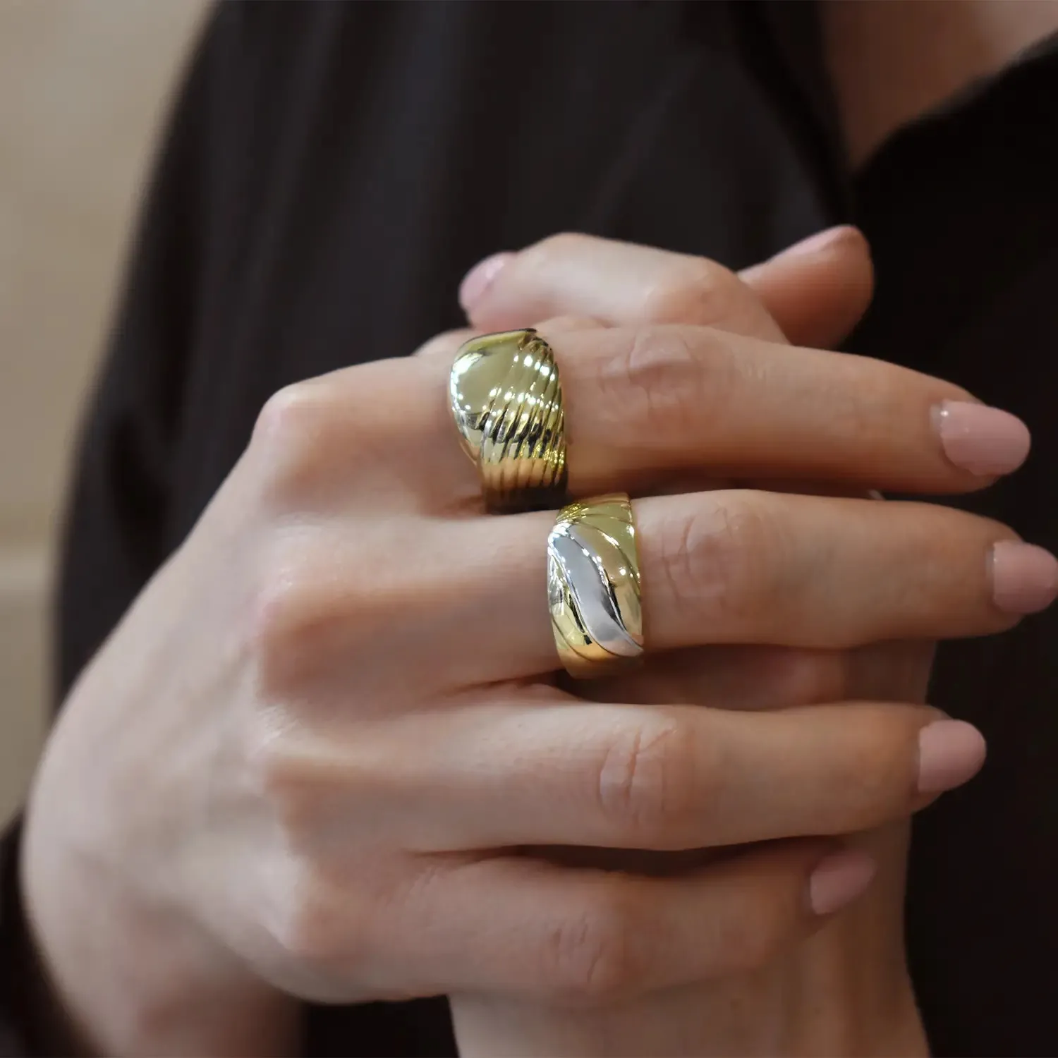 Anello realizzato in oro giallo 18kt con finitura lucida. Il design della parte superiore è caratterizzato da un doppio profilo: una sezione presenta una lavorazione ondulata a rilievo, mentre l'altra metà è a superficie liscia e lineare. Questo gioco di forme crea un contrasto asimmetrico moderno ed elegante. La struttura a fascia degradante garantisce un indosso confortevole e versatile.