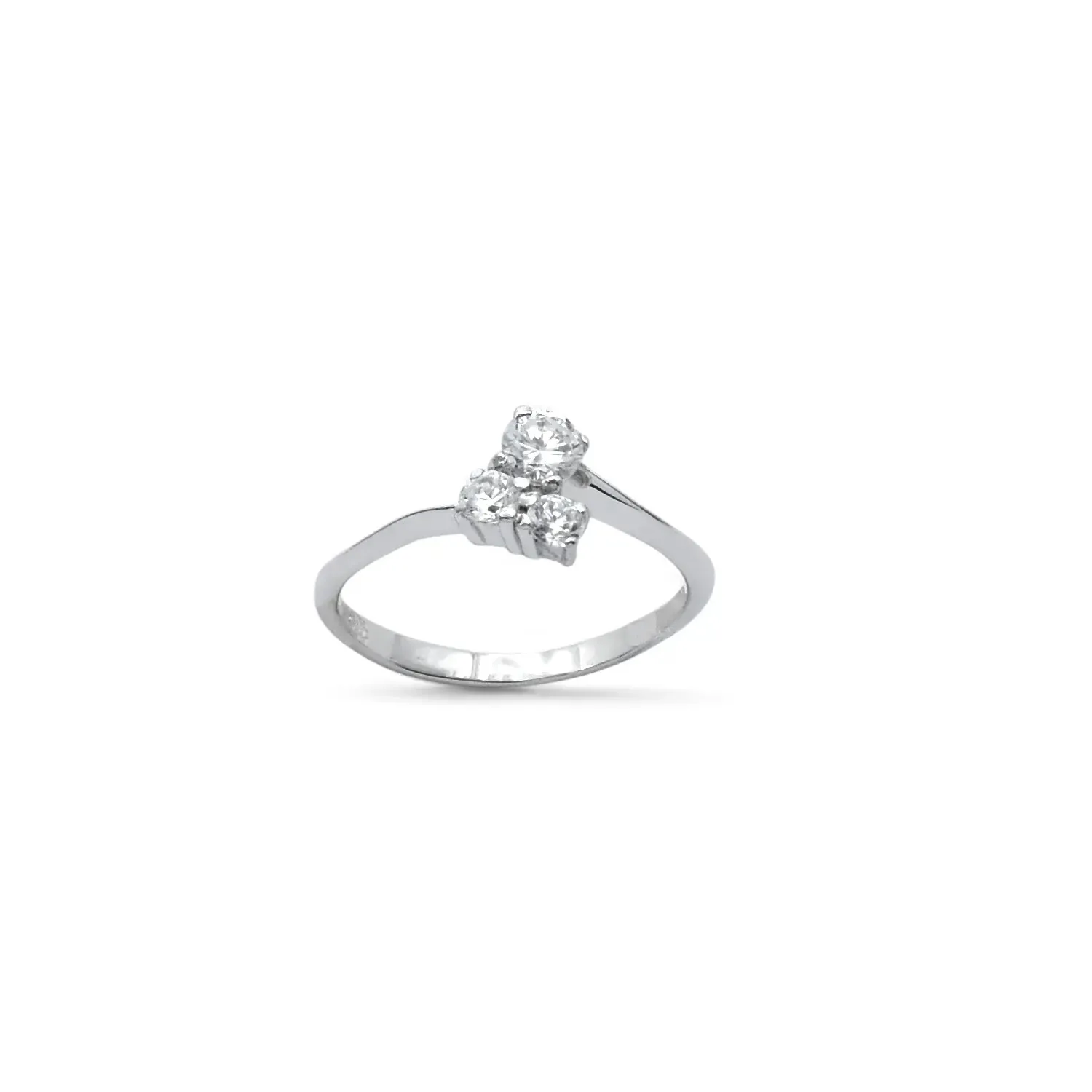 Elegante anello in oro bianco 18kt caratterizzato da un raffinato design a contrarié, dove le estremità della fascia si incrociano con grazia avvolgendo il dito. Il gioiello è impreziosito da tre zirconi taglio brillante, sapientemente incastonati a griffe per massimizzare il passaggio della luce e garantire una brillantezza superiore.