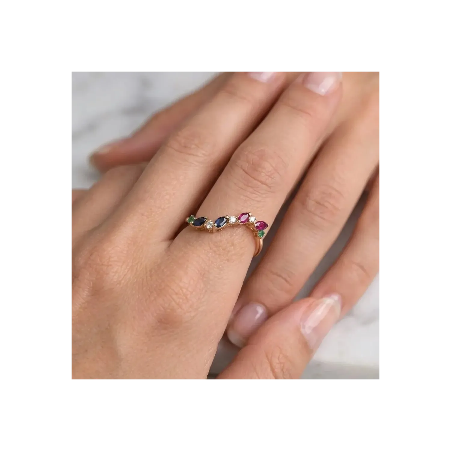 Questo raffinato anello in oro rosa 18kt è un inno alla vivacità e all'eleganza contemporanea. Il design minimalista della montatura esalta una sequenza preziosa di gemme: zaffiri e rubini (0,05 ct complessivi) si alternano a smeraldi (0,02 ct) e diamanti taglio brillante (0,03 ct) colore G purezza Vs, creando un ritmo cromatico unico e sofisticato.