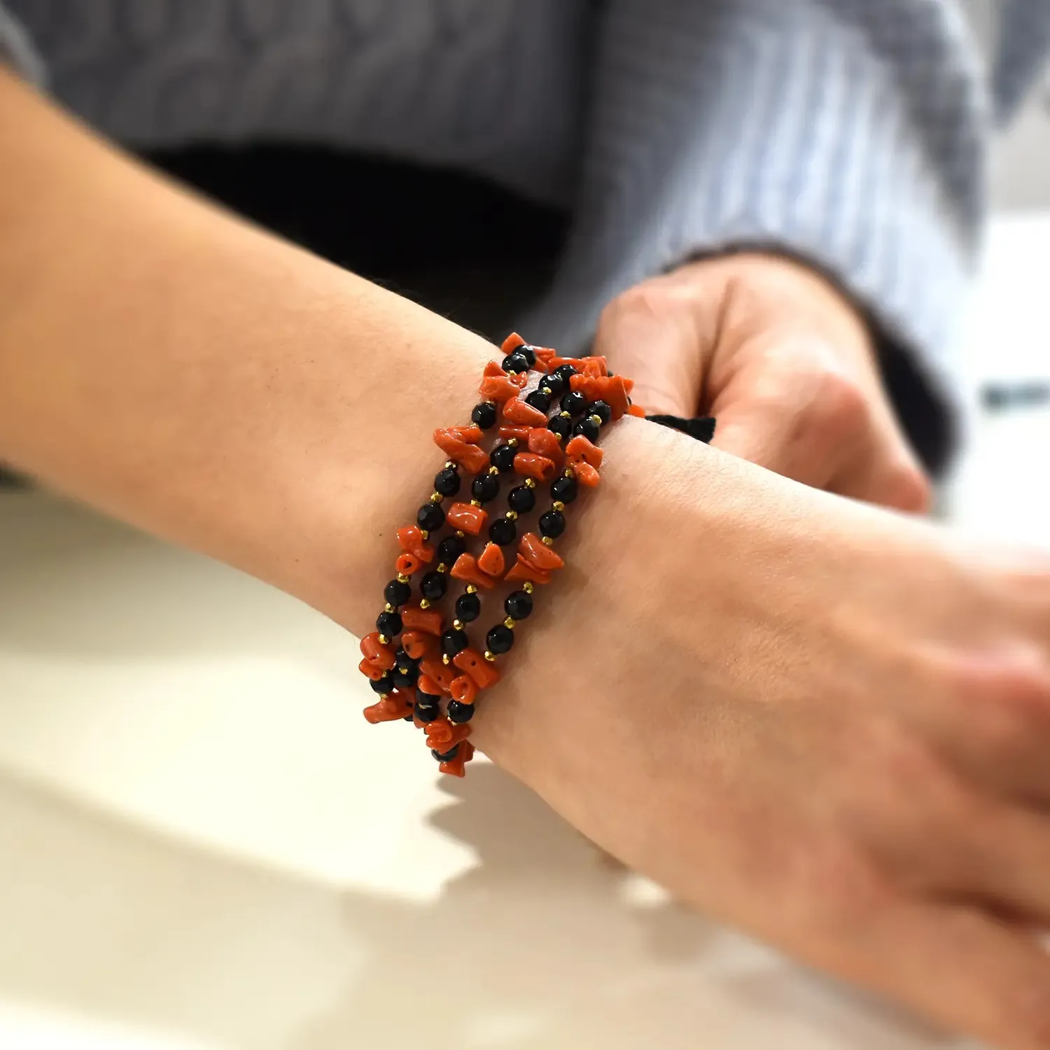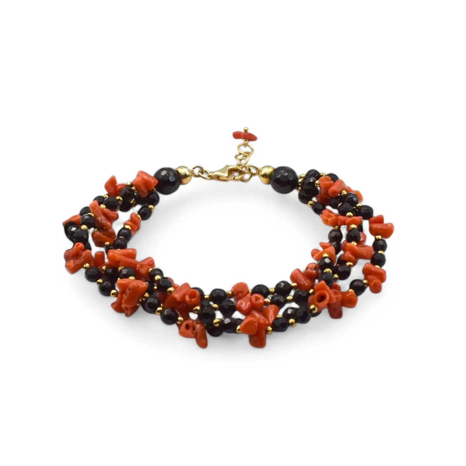 Bracciale con distanziatori sfere sfaccettate e chiusura in argento giallo, realizzato con onice e rametti di corallo rosso