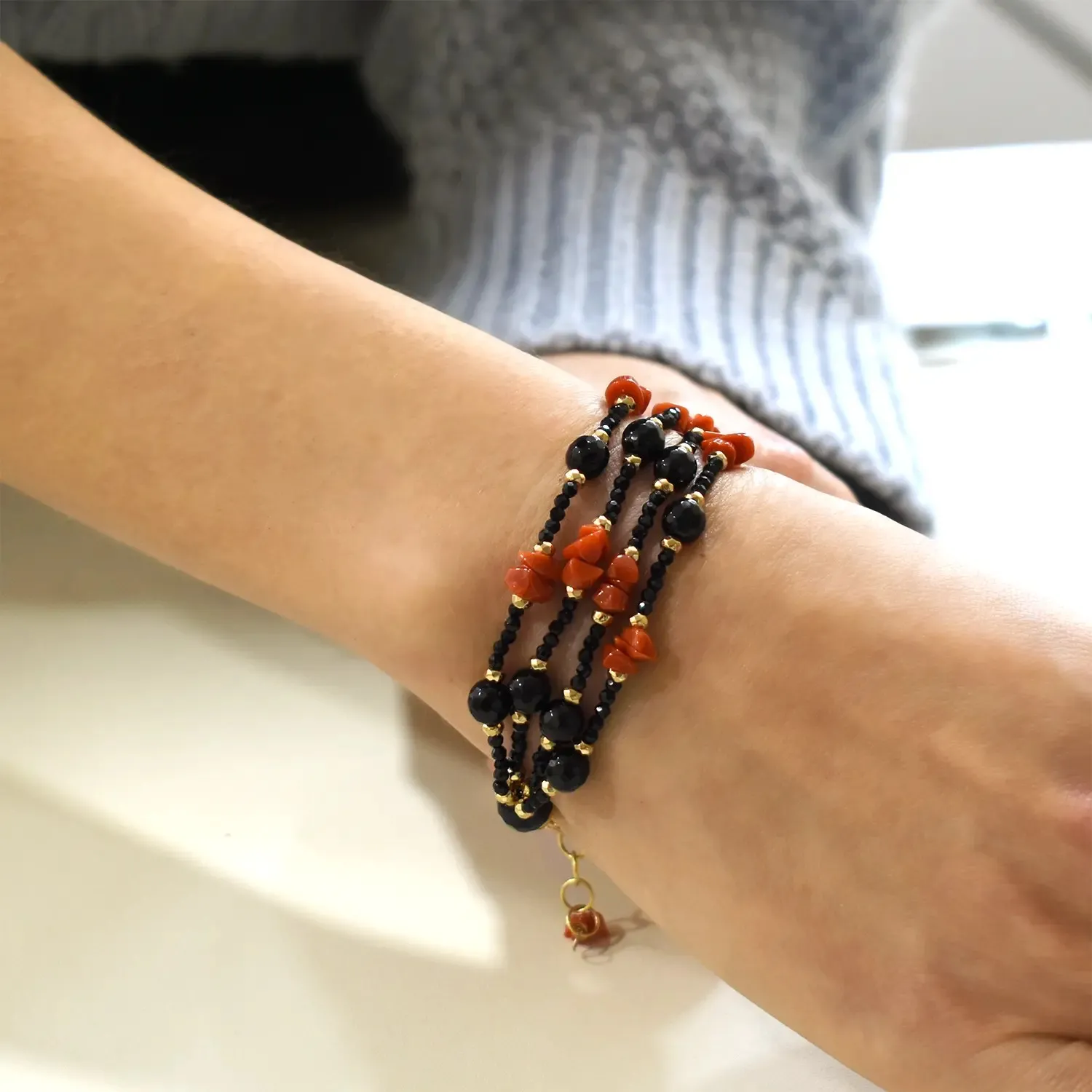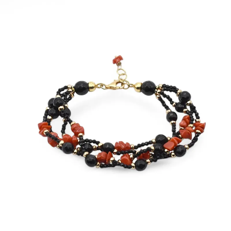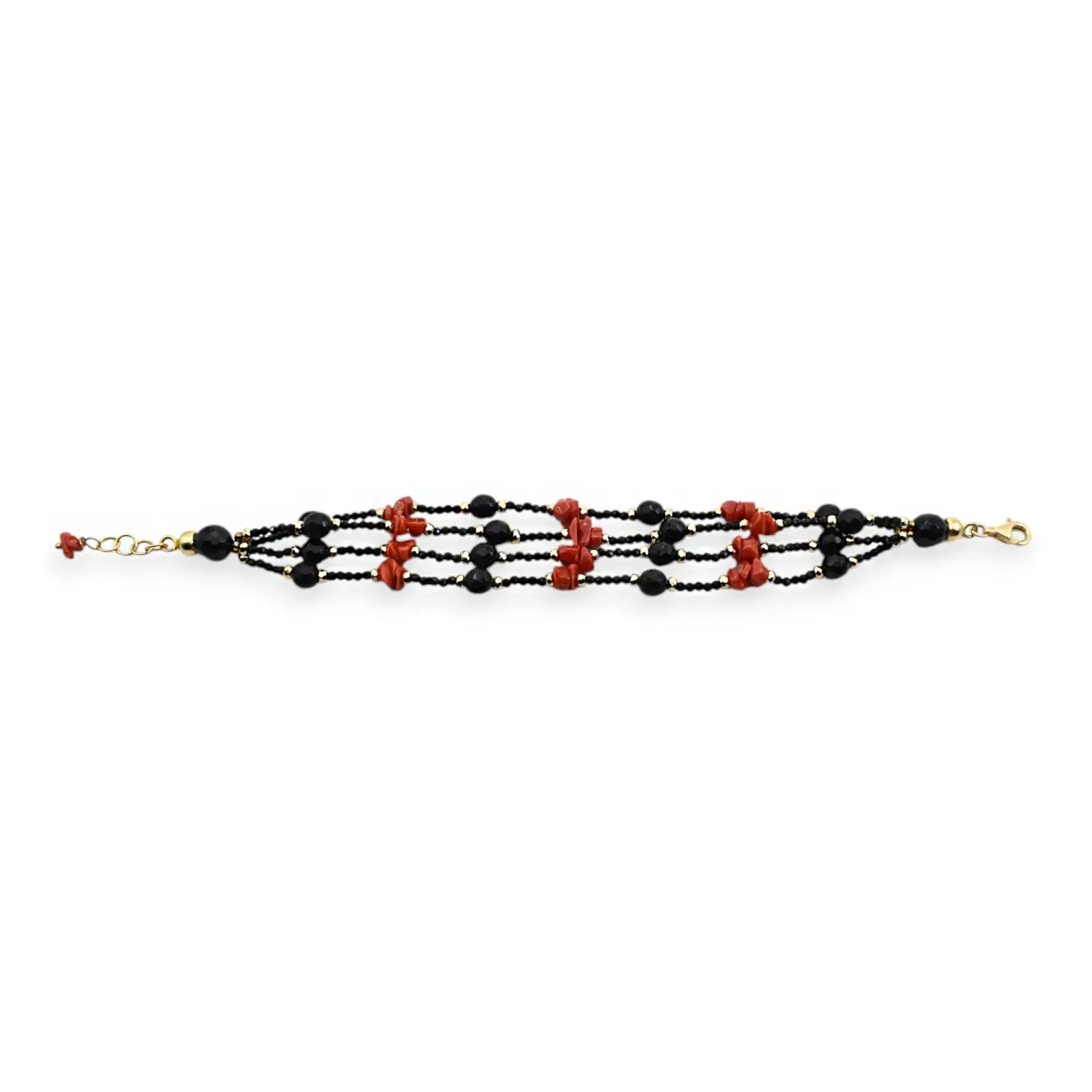 Bracciale con sfere di onice taglio briolette alternate a corallo rosso taglio chips. Chiusura a moschettone e distanziatori sfaccettati in argento 925 rodiato giallo