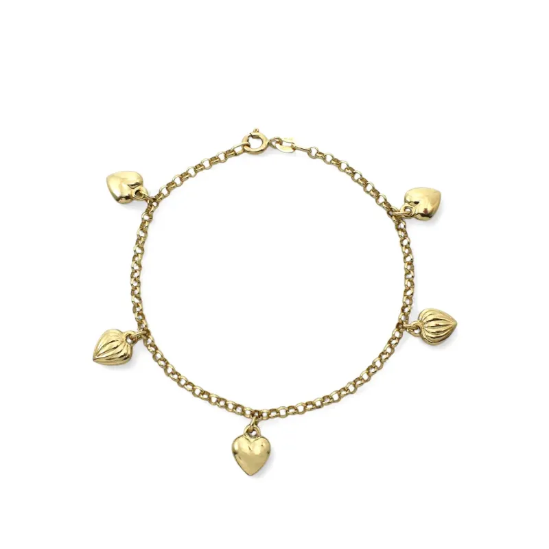 Bracciale Charm 5 Cuori Pendenti Lavorati Oro Giallo 18kt