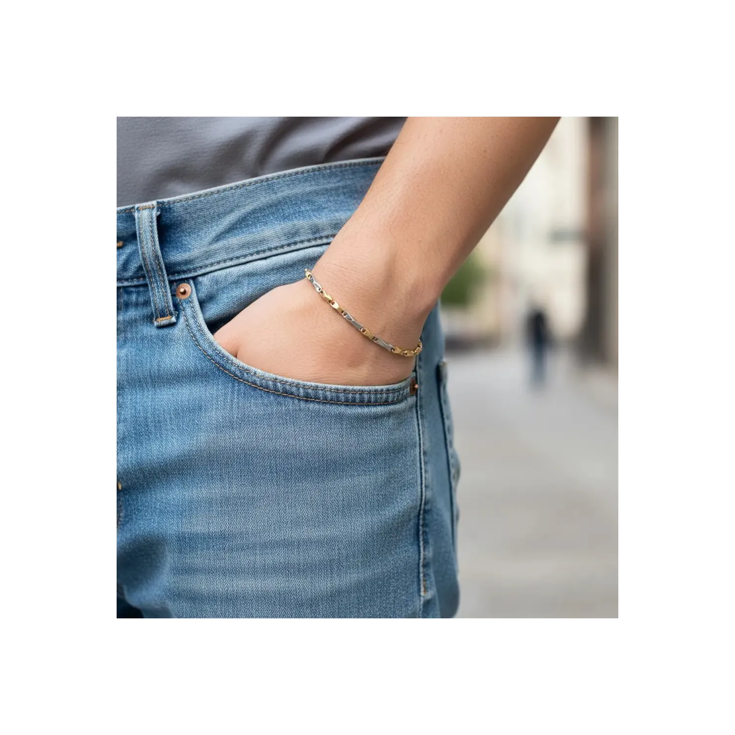 Questo elegante Bracciale da Uomo in Oro Bicolore 18kt è un accessorio raffinato e moderno. Presenta una maglia distintiva composta da elementi allungati e leggermente curvi, che alternano il lucido oro giallo al brillante oro bianco, creando un contrasto cromatico sofisticato e dinamico. Con una lunghezza di 21 cm (ideale per un polso maschile) e un peso di 4,40 gr, è un gioiello solido ma confortevole. Perfetto per aggiungere un tocco di classe al look quotidiano o per un'occasione speciale, è un regalo che combina stile e valore.