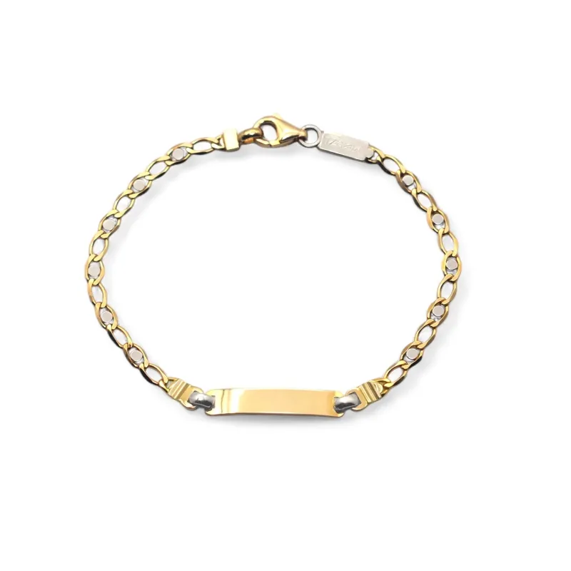 Bracciale junior in oro giallo 18kt. con targhetta da incidere e chiusura a moschettone.