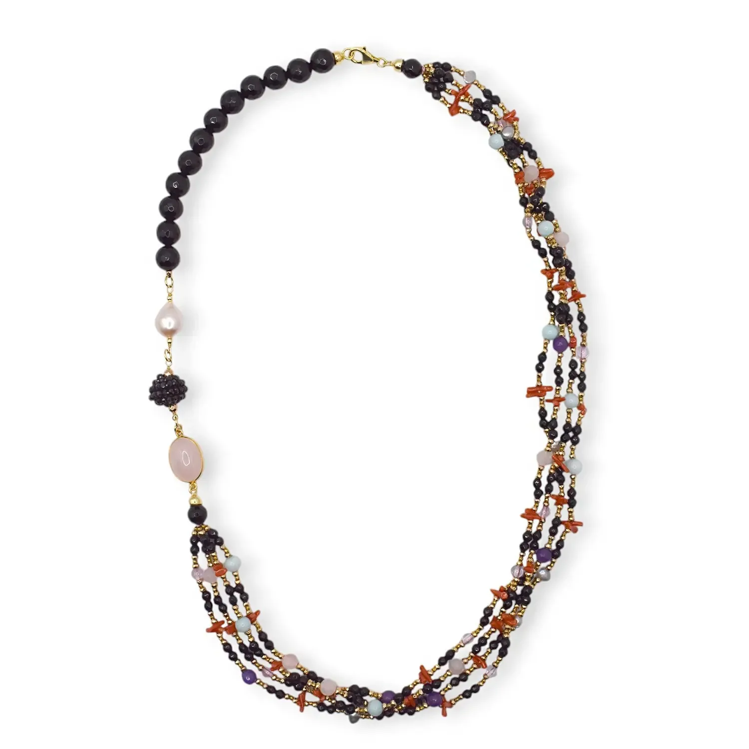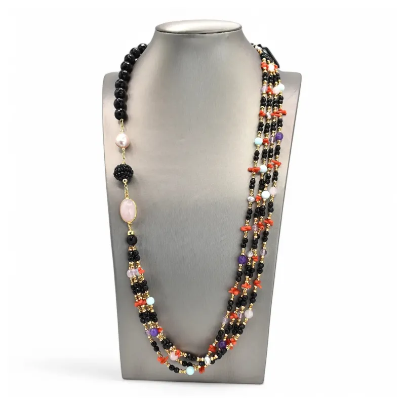 Collana con distanziatori e chiusura moschettone in argento 925 rodiato giallo, la lunghezza della collana è di 68 cm. Realizzato con pietre miste: corallo, ametista, cristallo di rocca, perle barocche, agate e onice.