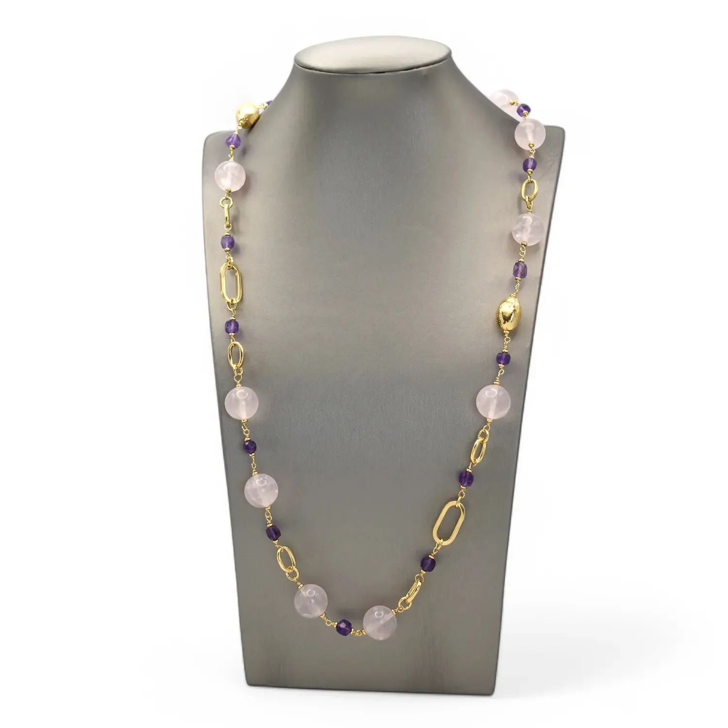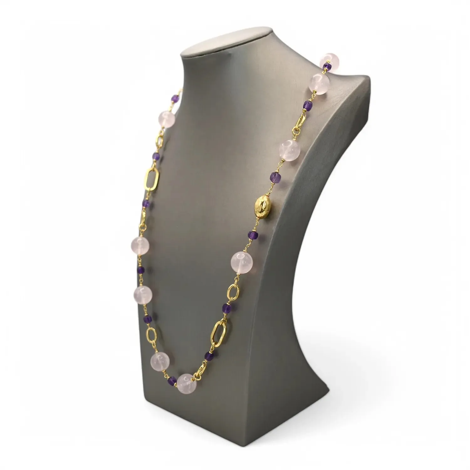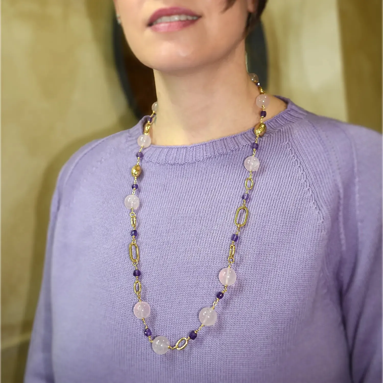 Collana in argento rodiato giallo 925 con ametista e quarzo rosa lunga 85 cm