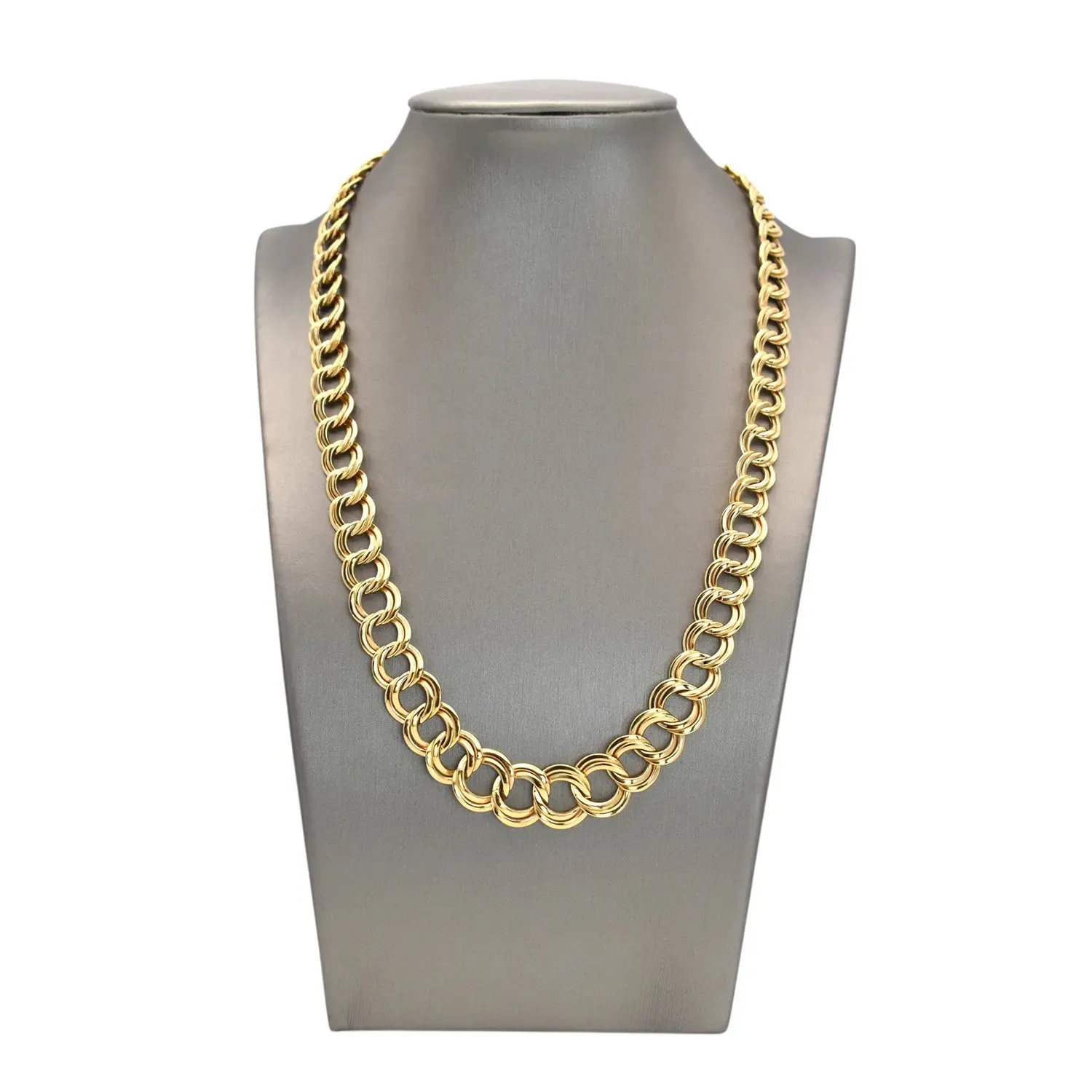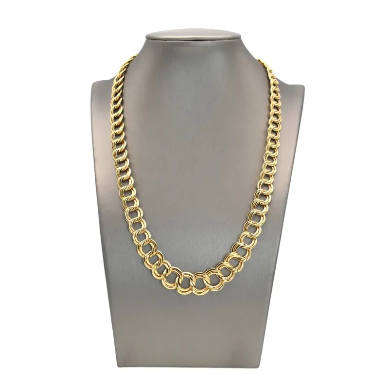 Elegante collana realizzata interamente in oro giallo 18kt con design a scalare. La maglia è studiata per aumentare di dimensione in modo armonioso, partendo da elementi più piccoli e sottili nella parte posteriore fino a raggiungere la massima grandezza nel centro del girocollo. Questa struttura garantisce un'ottima vestibilità e mette in risalto il decolleté. Lunghezza di 45 cm, rifinita con una chiusura di sicurezza robusta. Un gioiello intramontabile, ideale sia per l'uso quotidiano che per occasioni formali.