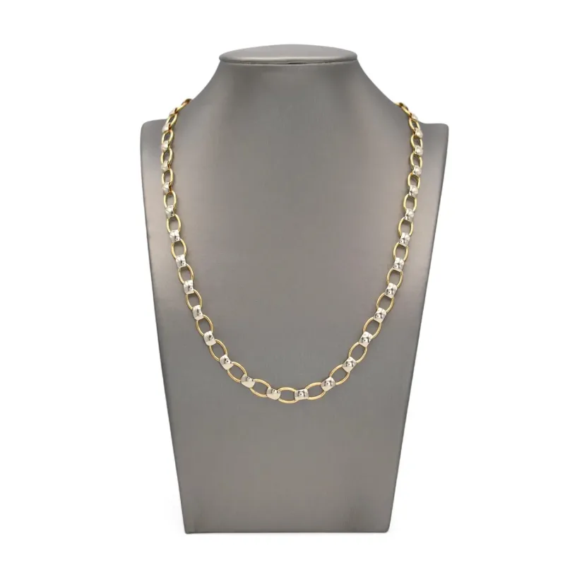 Elegante collana realizzata in oro 18kt caratterizzata dal contrasto cromatico tra l'oro giallo e l'oro bianco. Il design alterna i due colori in una maglia luminosa e versatile, ideale per essere abbinata con facilità a diversi stili e gioielli. Con una lunghezza di 45 cm, il girocollo si posiziona in modo armonioso sul decolleté, offrendo una lucentezza impeccabile grazie alla finitura interamente lucida.