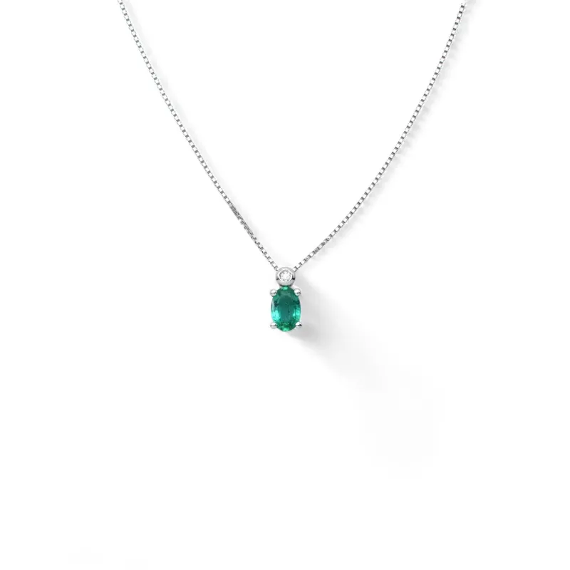 Questa raffinata collana in oro bianco 18kt presenta un elegante pendentif dal design classico. Il protagonista è uno smeraldo di taglio ovale da 0,05 ct, sormontato da un diamante taglio brillante da 0,01 ct colore G purezza Vs che funge da prezioso punto luce.
