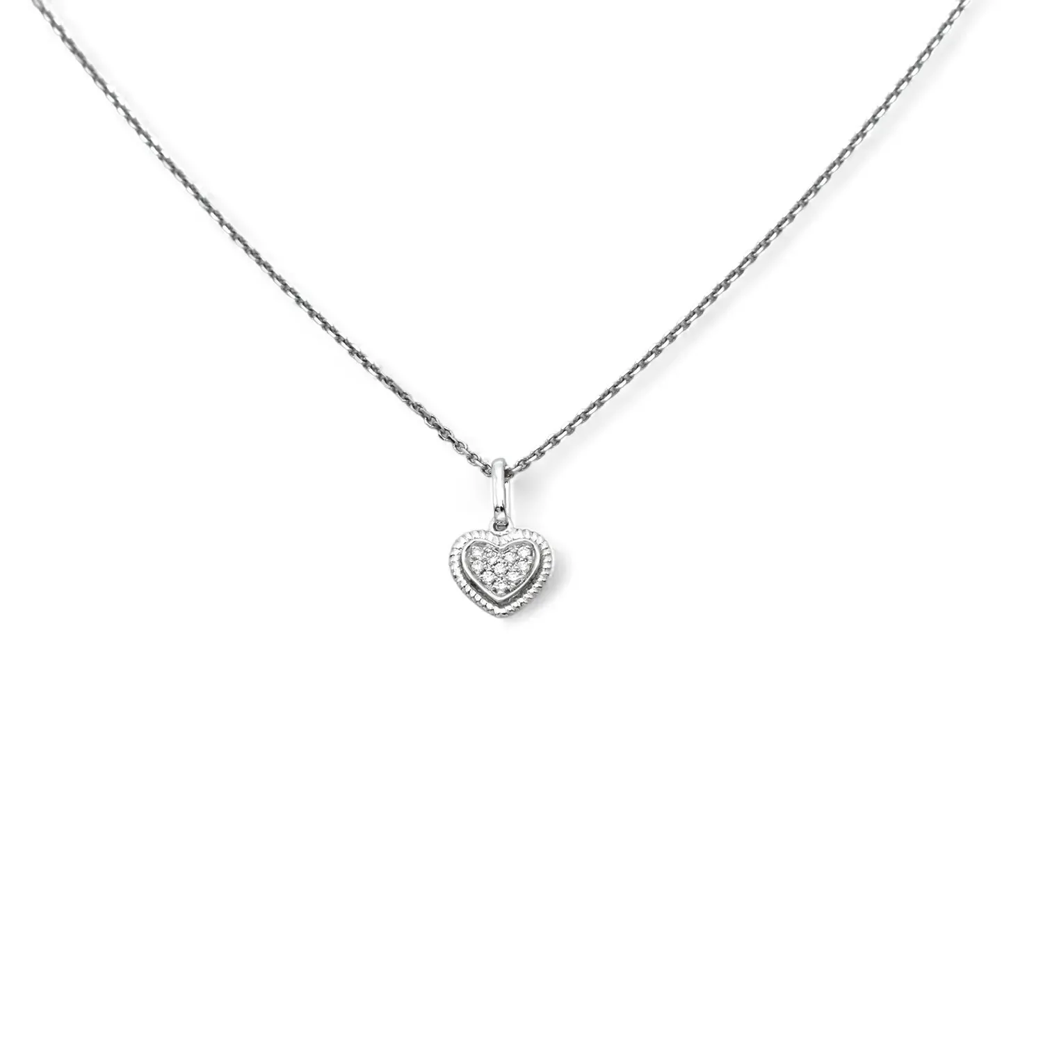 Questa delicata collana in oro bianco 18kt è un omaggio alla femminilità più pura. Il protagonista è un grazioso pendente a forma di cuore, finemente lavorato e impreziosito da un luminoso pavé di diamanti taglio brillante, per una caratura totale di 0,04 ct. colore G purezza Vs