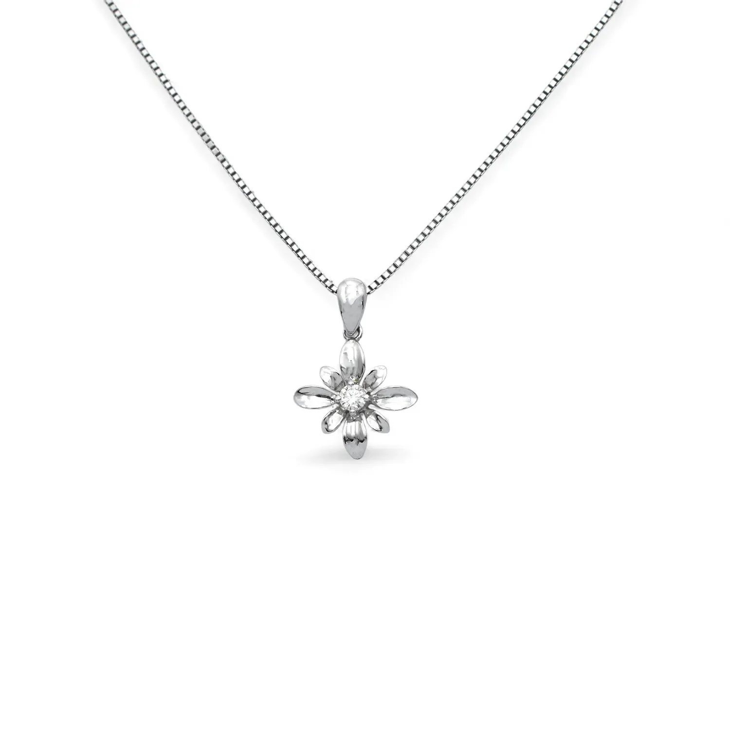 Questa delicata collana in oro bianco 18kt incanta per la sua eleganza naturale e il design ispirato alla flora. Il pendente a forma di fiore stilizzato è caratterizzato da petali in oro lucido che incorniciano un prezioso diamante taglio brillante centrale da 0,07 ct, colore G purezza Vs che cattura e riflette la luce con estrema brillantezza.