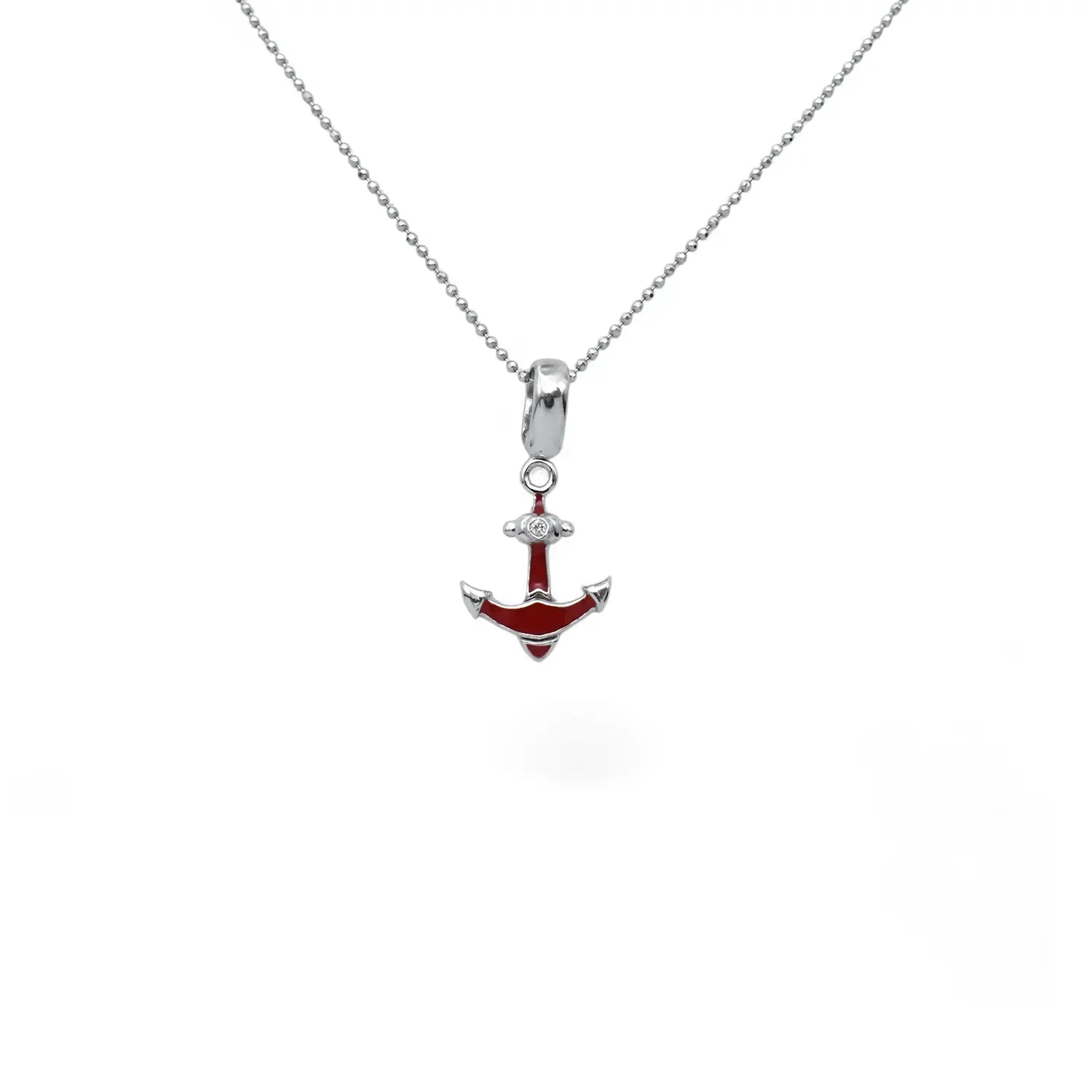 Questo grintoso girocollo in oro bianco 18kt celebra il simbolismo dell'ancora, emblema universale di stabilità, speranza e legame indissolubile. La catena, realizzata con una moderna maglia a palline lisce, sostiene un pendente a forma di ancora rifinito con un vivace smalto rosso che ne sottolinea le linee dinamiche e sportive.