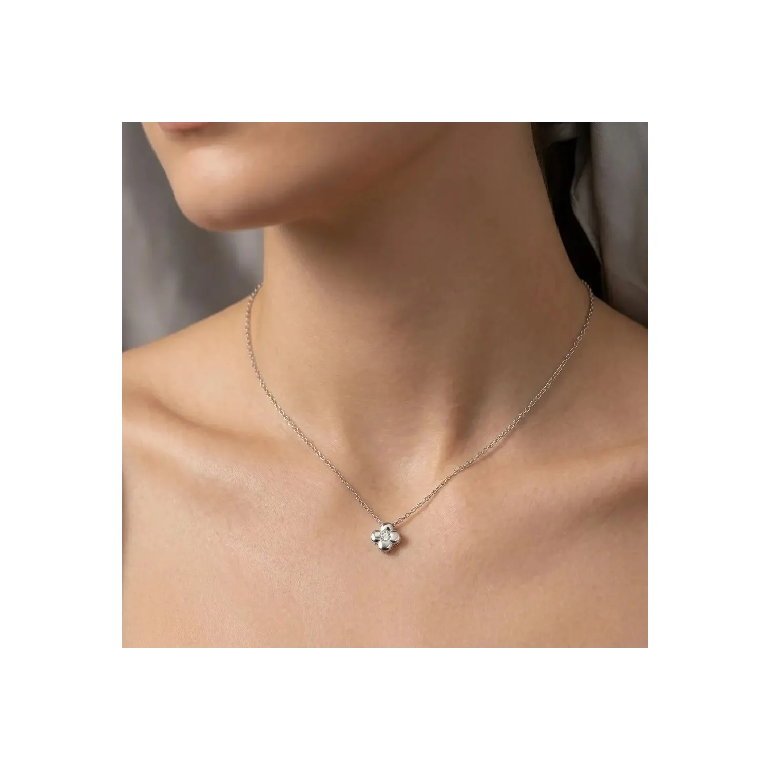 L'eleganza incontra la simbologia in questo raffinato girocollo in oro bianco 18kt. Il protagonista è un delicato pendente a forma di quadrifoglio bombato, le cui linee dolci e levigate evocano la freschezza di un fiore appena sbocciato. Al centro di questo prezioso portafortuna brilla un diamante taglio brillante da 0,03 ct, incastonato con precisione per catturare e riflettere ogni raggio di luce.