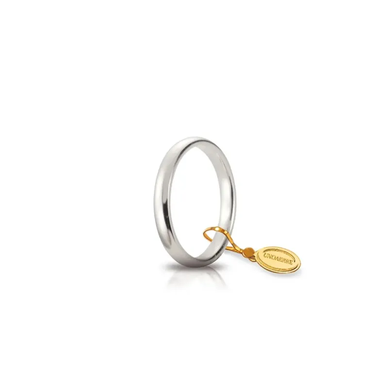 Fedi Fede Francesina in oro bianco gr. 4.0 UnoAerre 040AFN0040000 Fede Classica "Francesina" bombata liscia in oro 750. Gr 4,00 - Mm 2,85 La forma elegantemente sottile e raffinata rende questo anello il simbolo preziozo e discreto di un amore forte e duraturo. Vedi